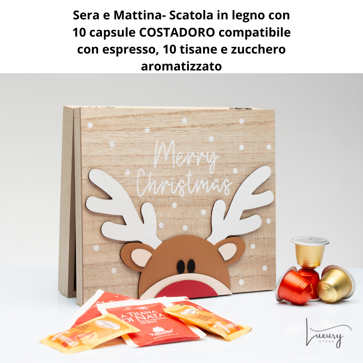 Cerchi un'idea regalo che sia utile, elegante e solidale? La scatola in legno porta capsule e tisane della linea Babbomatto di Cuore Matto è la soluzione perfetta! Realizzata in legno di alta qualità, questa scatola ti permette di conservare le tue capsule di caffè in modo ordinato e con stile. Con l'acquisto riceverai anche 10 capsule di caffè,COSTADORO compatibili con nespresso,10 tisane e zucchero aromatizzato, pronte da gustare. Il vero valore? Supporti progetti di solidarietà, perché parte del ricavato sostiene cause benefiche.