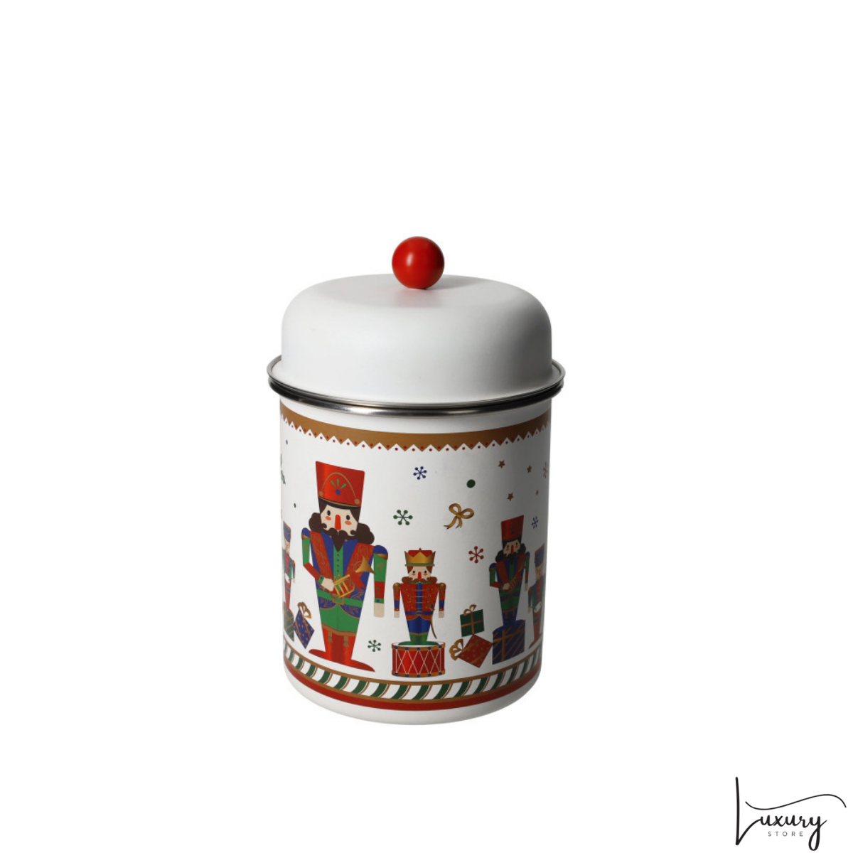 Il barattolo è realizzato in metallo bianco di alta qualità, resistente e leggero. Il motivo ispirato allo Schiaccianoci aggiunge un tocco fiabesco e natalizio, ma è talmente versatile da adattarsi perfettamente a qualsiasi ambiente durante tutto l’anno. Le linee pulite e il colore neutro lo rendono adatto sia per una cucina moderna che classica.