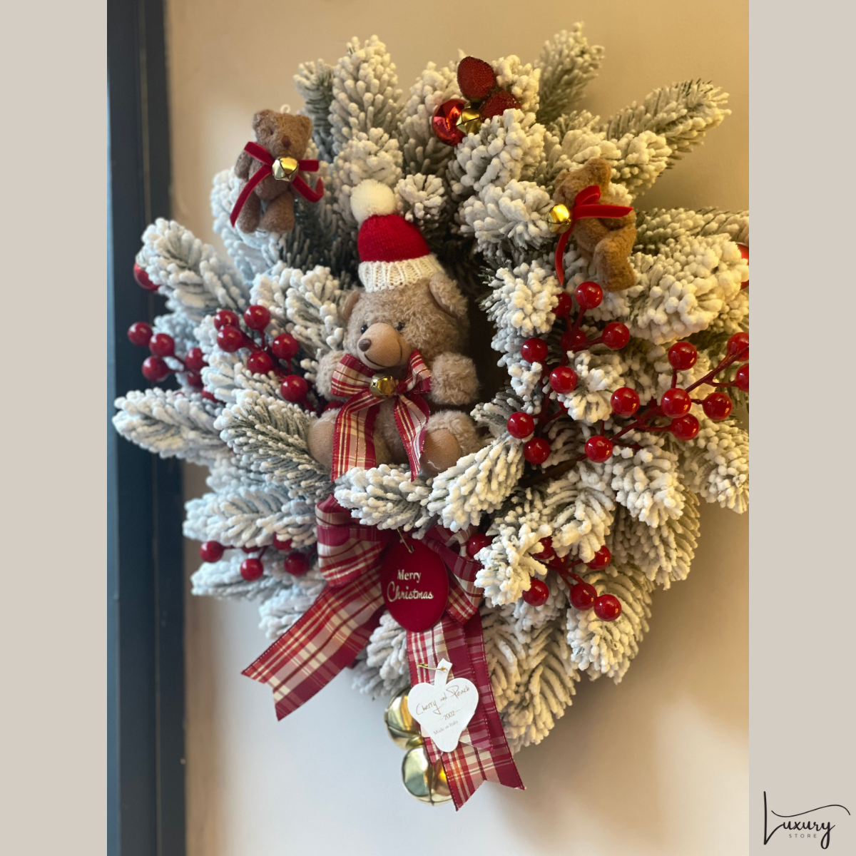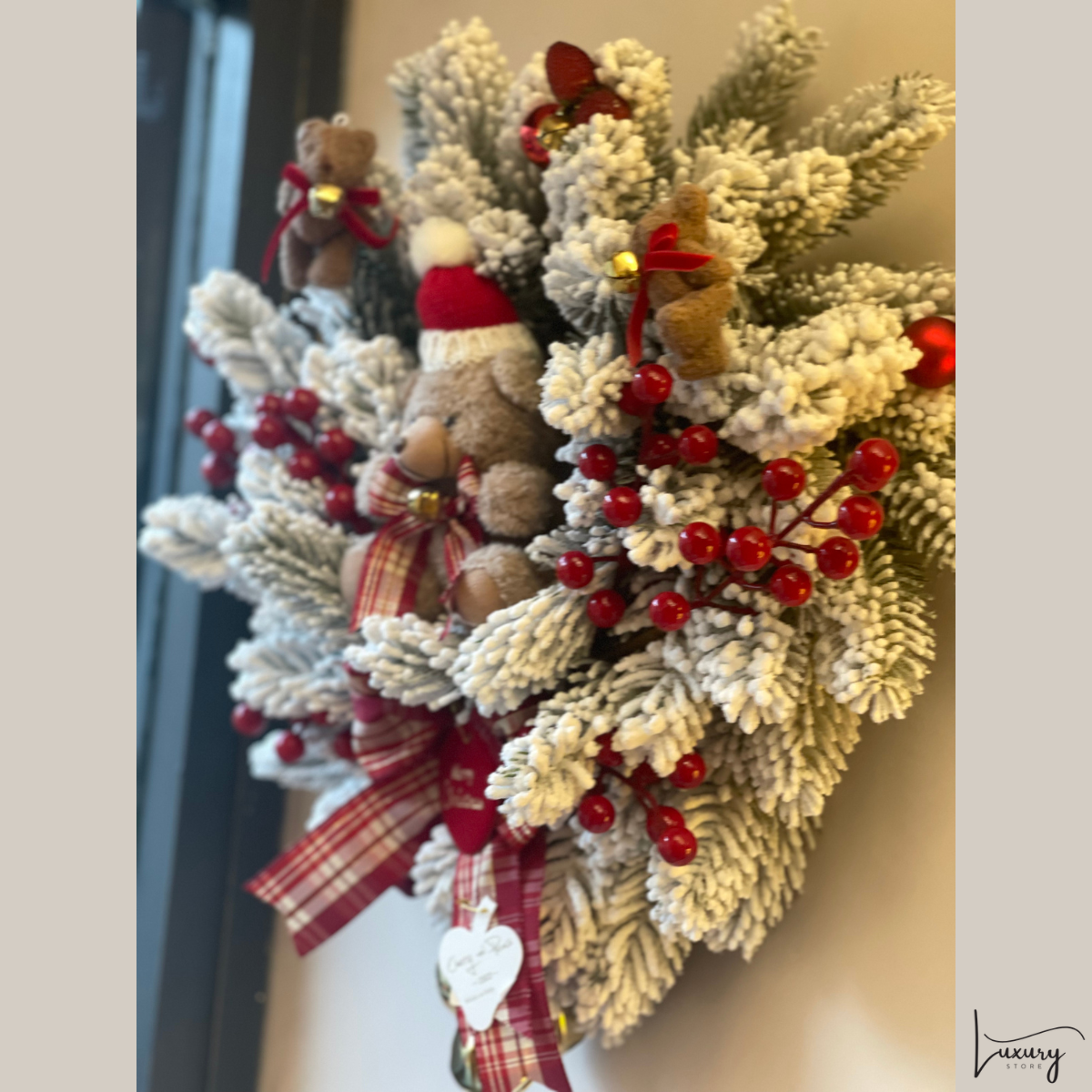 Con il suo diametro di 35 cm, questa ghirlanda fuoriporta unisce il fascino tradizionale delle decorazioni natalizie alla dolcezza senza tempo del tenero orsetto Teddy, simbolo di affetto e serenità.