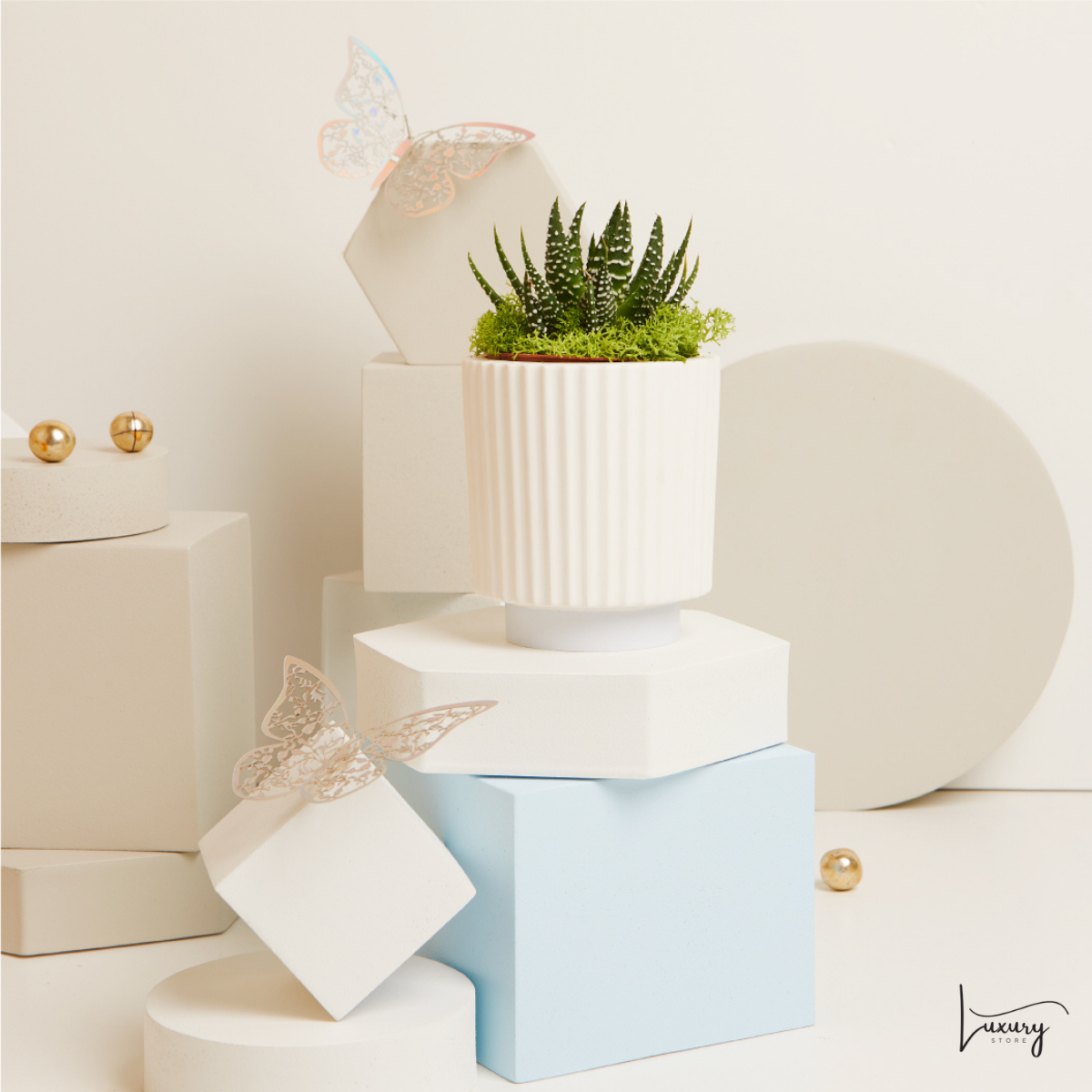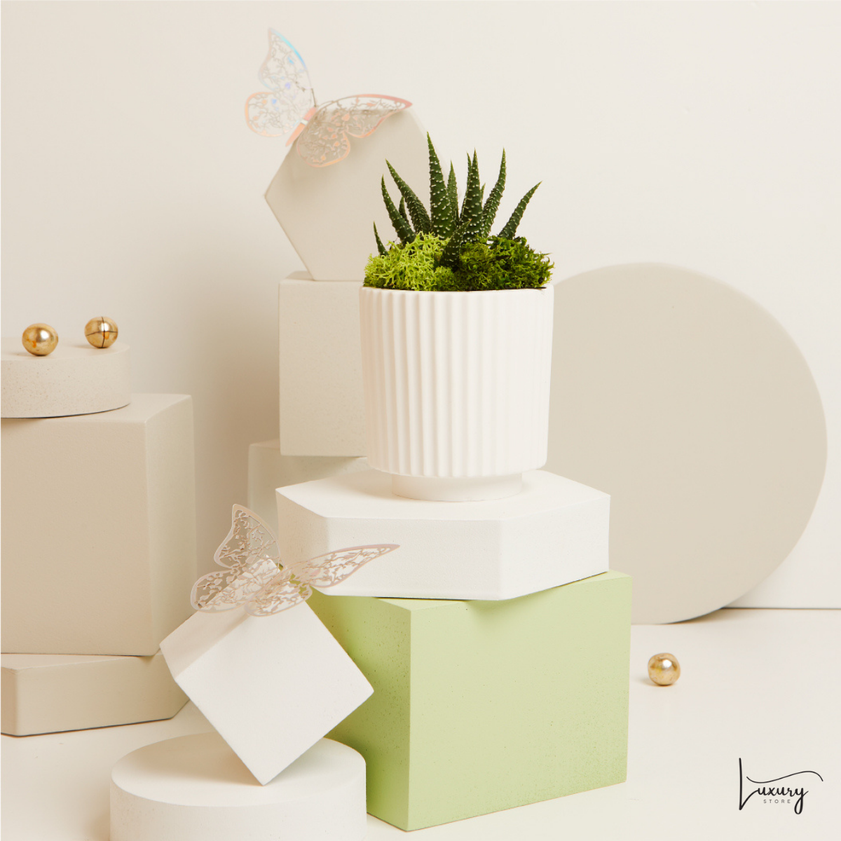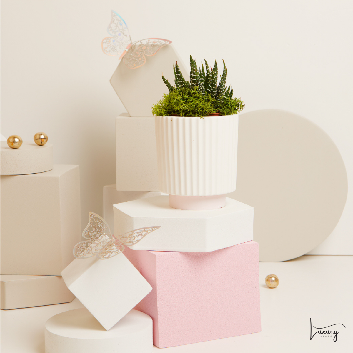 Se ami i dettagli raffinati e le decorazioni ispirate alla natura, il vasetto a righe con piantina e muschio di Claraluna è l’accessorio perfetto per arricchire i tuoi spazi con stile e armonia. Questo delizioso complemento d’arredo unisce la semplicità della ceramica alla freschezza del verde, creando un oggetto di design versatile e sofisticato.