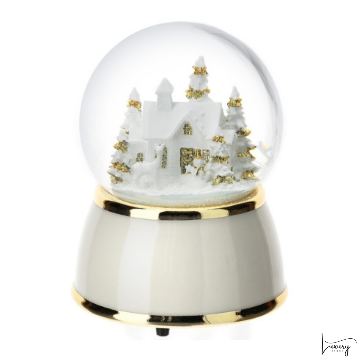 Questa palla di neve Hervit, curata nei minimi dettagli, è realizzata in resina di alta qualità e impreziosita da una base bianca con eleganti dettagli dorati, simbolo di raffinatezza e stile senza tempo.