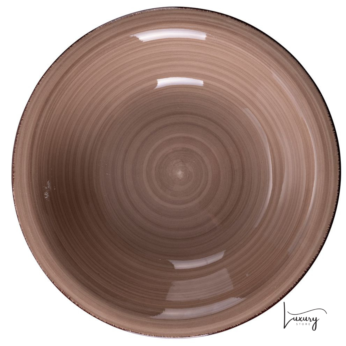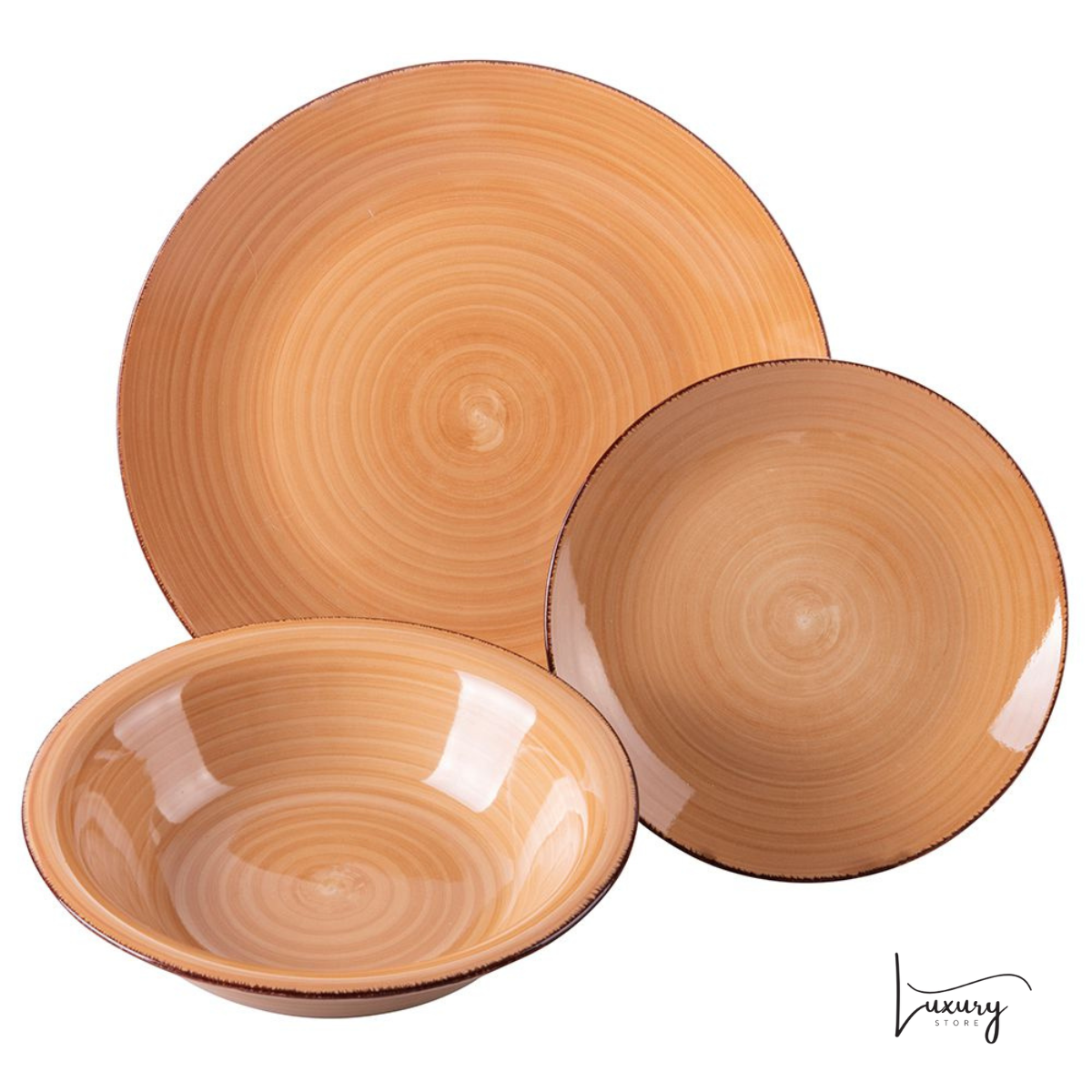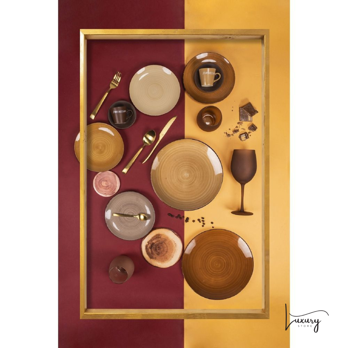 Ogni set comprende 6 piatti piani, 6 piatti fondi e 6 piatti frutta, ognuno in una diversa sfumatura di color cioccolato 🍫, per un effetto cromatico elegante e avvolgente. Perfetti per sorprendere i tuoi ospiti e rendere unica la tua mise en place.